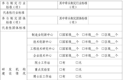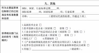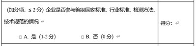 4.主持或参与制修订国际、国家、行业标准数量。指企业主持或制修订国际、国家、行业标准数量。计算方法为:截至上年末,企业主持制(修)订国际标准数量*5十主持制(修)订国家标准或者行业标准数量*3十参与制(修)订国际标准数量*2十参与制(修)订国家标准或者行业标准*1。 |