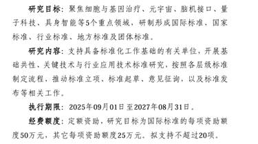 聚焦细胞与基因治疗、元宇宙、脑机接口、量子科技、具身智能等5个重点领域,研制形成国际标准、国家标准、行业标准、地方标准及团体标准。研究目标为国际标准的每项资助额度50万元,其它每项资助额度25万元。拟支持不超过20项。 |